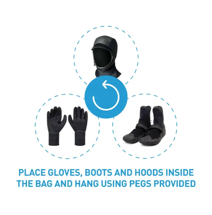 - Place gloves, boots and hoods inside the bag and hang using pegs provided (4 pegs provided)