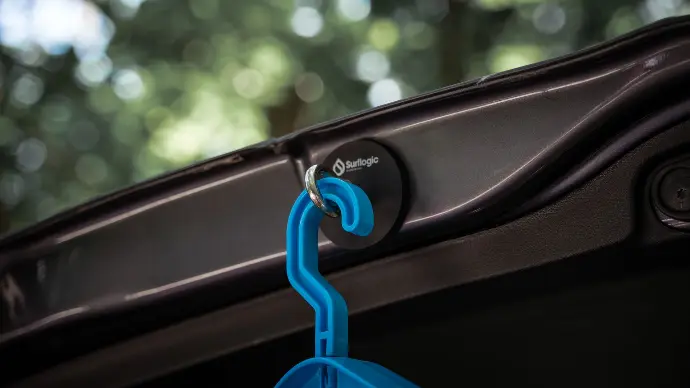 El gancho magnético para trajes de surf Surflogic está diseñado para colgar el traje de forma rápida y segura sobre superficies metálicas, sin necesidad de taladros ni herramientas. Gracias a su potente imán con recubrimiento de goma de silicona, ofrece una fijación fuerte y duradera mientras protege las superficies.