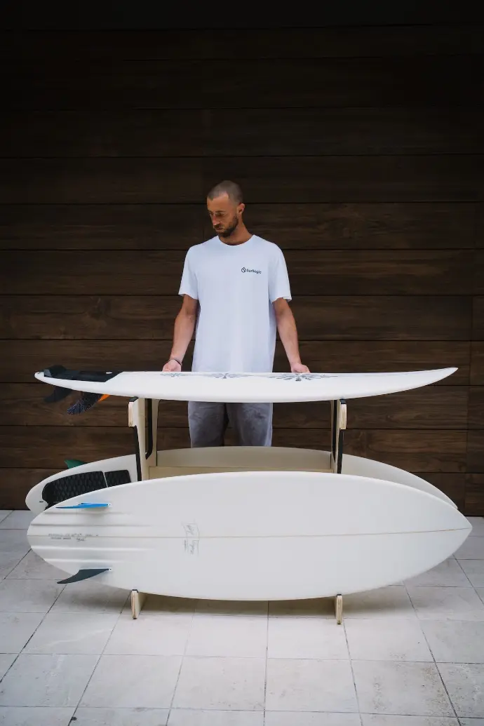 The Surfboard Shaper Stand is a versatile solution designed for surfboard maintenance, repair and storage. Ideal for waxing, ding repair, fin setup or general board handling, it provides a stable and practical working platform. The design fits all types of surfboards and includes foam padding to protect contact areas from damage. It can also store up to 3 boards, making it useful both as a work stand and storage system. Lightweight and easy to carry thanks to its integrated handle, it’s perfect for home, garage or surf workshop use.